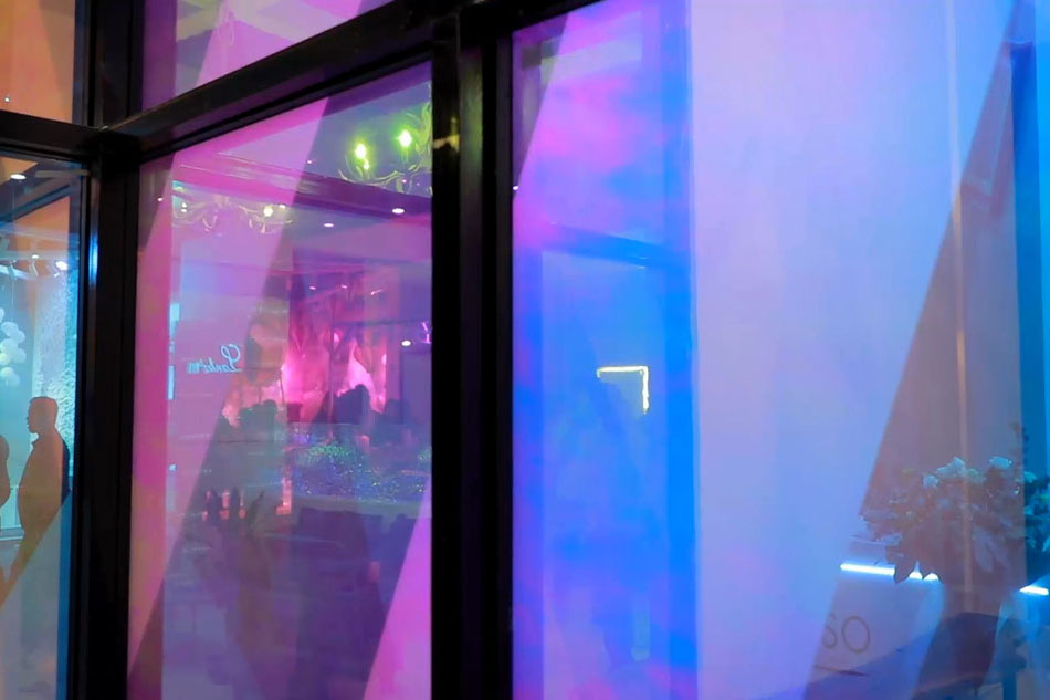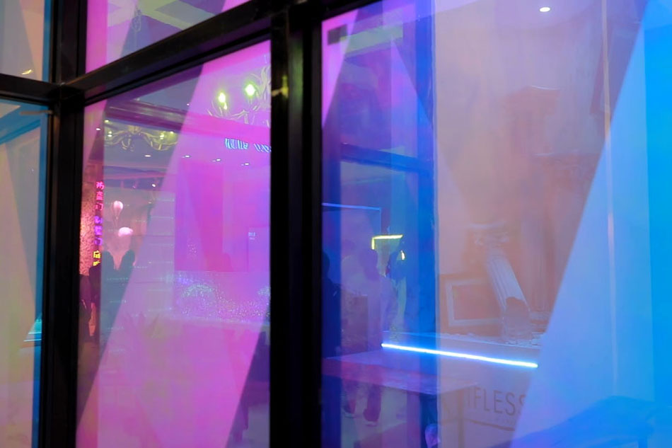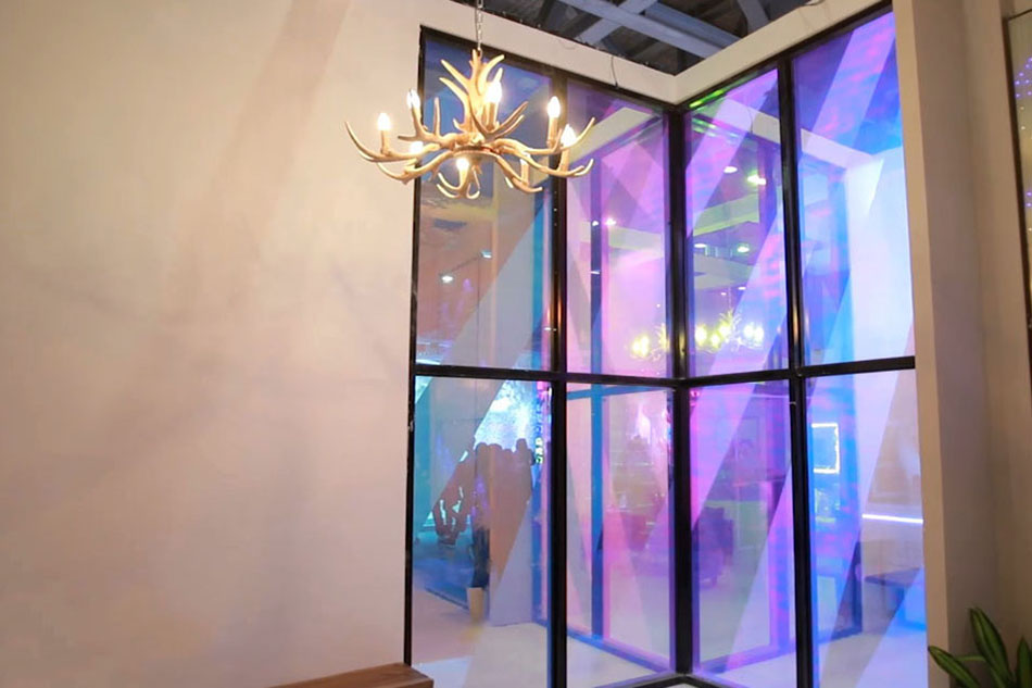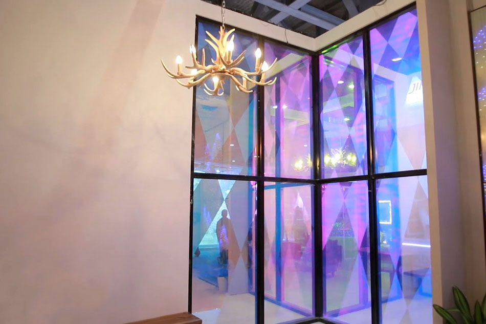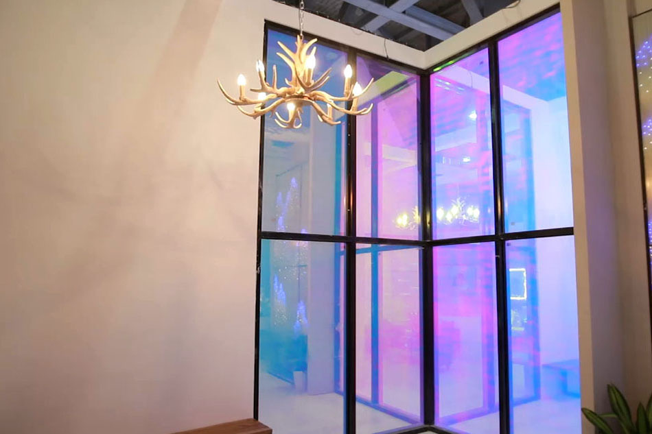 玻璃里面不止有液晶膜,还有带水波纹或云雾效果的彩膜,在不同的角度观看会呈现不同的效果。