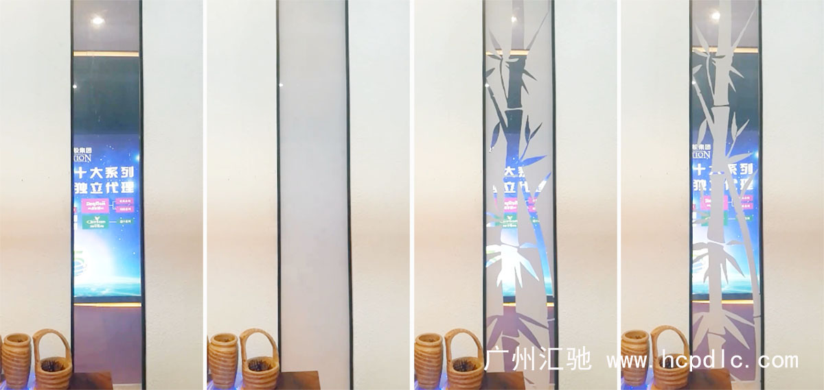 玻璃还是雾化玻璃,只是在原雾化玻璃的基础上,设计出透明或雾化的图案区域,再通电控制需要显示的区域,玻璃就可以有“透明——雾化——显示图案”三种基本状态了。图案可以是单个图案,也可以是多种图案组合,图案可以静止,也可以变化,这样就会有多种展现效果了。