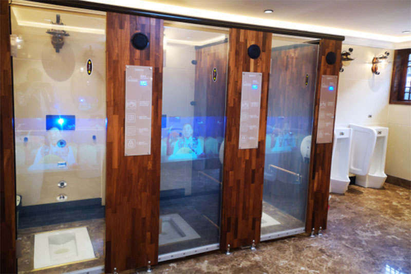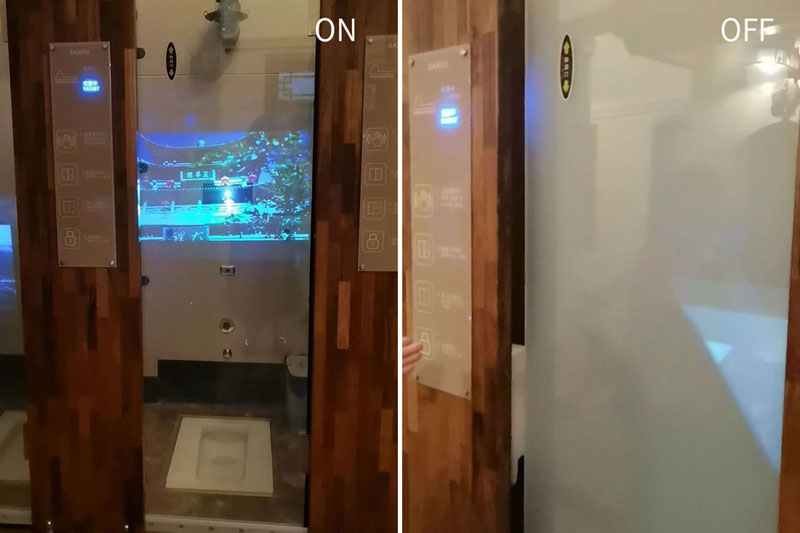 首先,让人感触最深的就是厕所的玻璃门,许多不了解的游客都看傻了眼,纷纷感叹:要不要这么开放?透明的门怎么方便啊?其实,这是连接了感应控制系统的调光玻璃门。没有人在里面的时候,玻璃门呈透明状态,让人一眼就能看到有空位;当有人进入厕所关上门后,玻璃门就会由透明瞬间转换为不透明的雾化状态,里面和外面都互相看不见,但玻璃的透光性良好,在里面的人不会感觉黑暗。