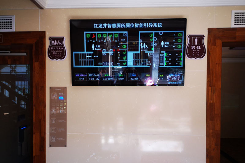 进入公厕之后,就能看到正前方的墙上挂着一个电子屏幕,可以查看厕所内的空间平面图和各个厕所分布位置,还可以通过红绿色的标志查看厕位是否正在被使用,有效避免厕所拥挤和排队的情况。